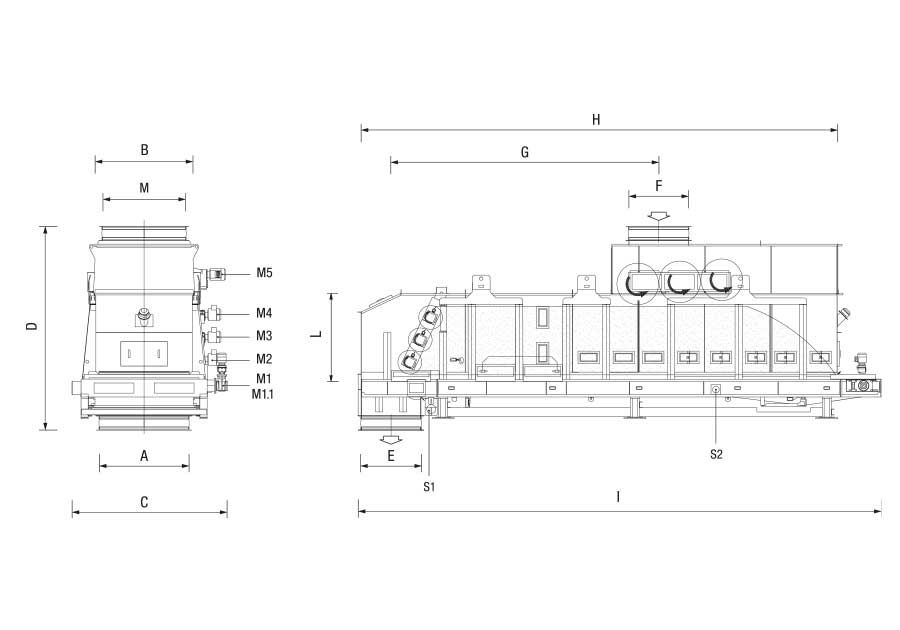 MODEL | MAX THROUGHPUT kg/h | VOLUME m3 | TOTAL SUCTION S1 - S2 m3/h | INSTALLED POWER kW | WEIGHT kg |