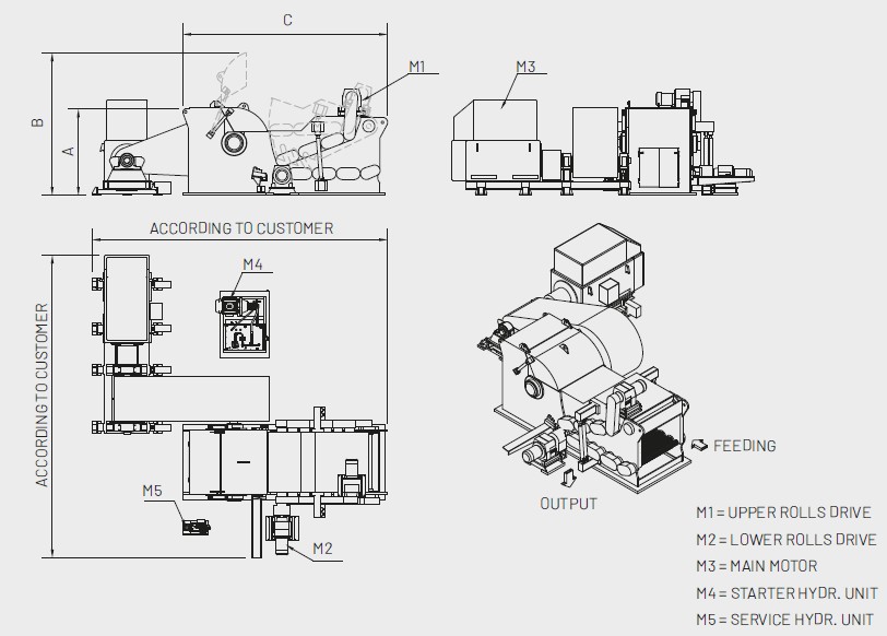 MODEL | OVERALL DIMENSIONS mm | MATERIAL INFEED SECTION mm | ROTOR mm | KNIVES No. | MAIN MOTOR POWER kW | WEIGHT WITHOUT MOTOR kg | CAPACITY |