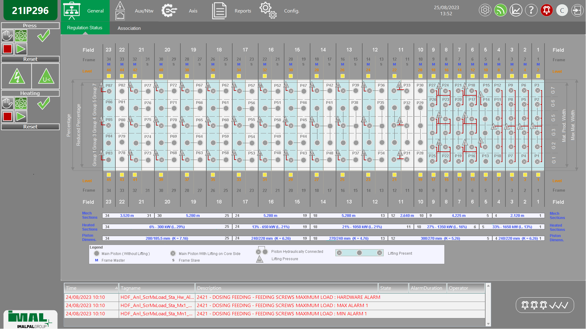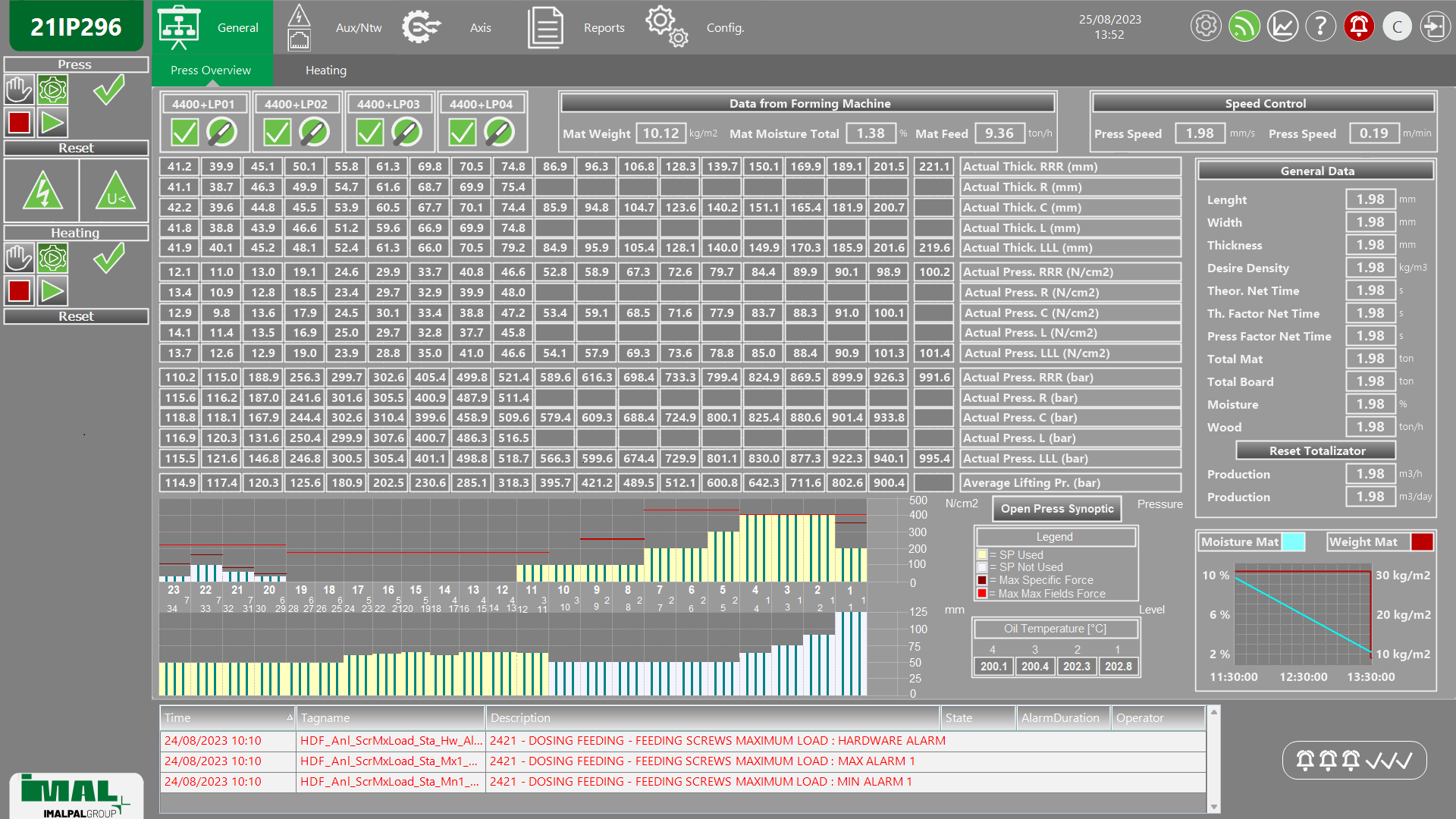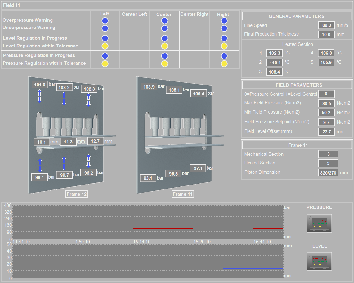 • The system consists of electric cabinets, housing PLCs equipped with remotely controlled digital and analogue inputs and outputs and special cards for reading the magnetostrictive level sensors. These sensors will be supplied in a suitable quantity and of a suitable length for the press in relation to the range of thicknesses that will be produced