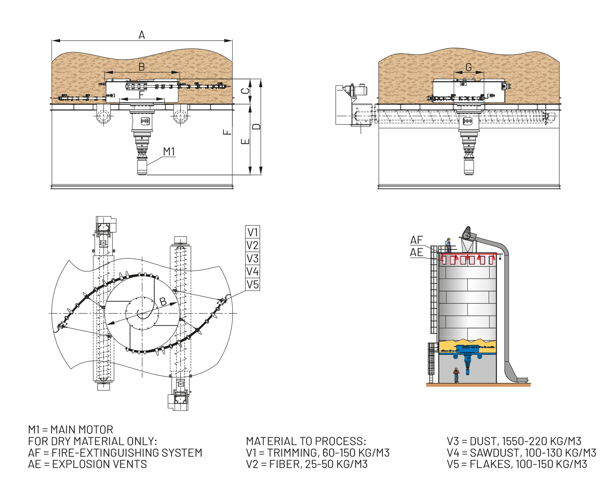• Versatile destorage-dosing system for wet or dry fractioned materials i.e. chips, sawdust, shavings, particles, dust, fiber, etc.