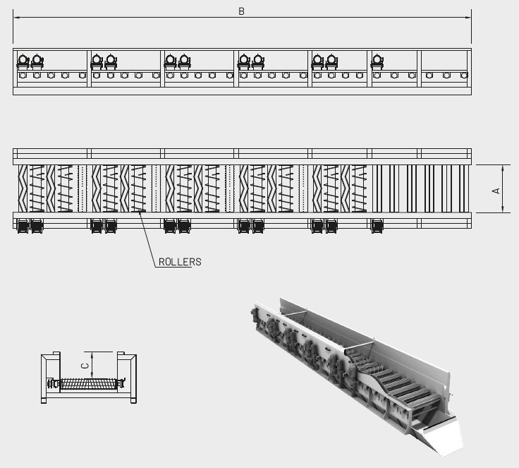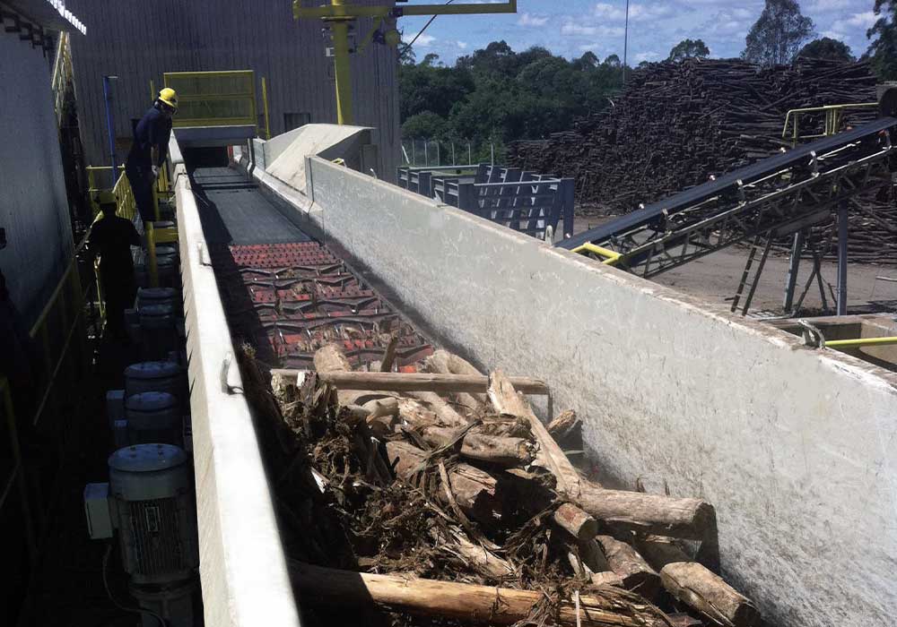 The machine is a roller system designed for log cleaning and pre-processing, ensuring a steady and continuous material flow to the next processing stages