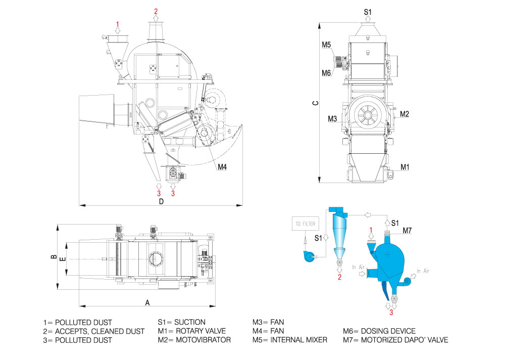• Cleaning chamber fitted with: adjustable feeding flaps – cleaning sections – exhaust air recovery – rotary valve for the discharge of heavy pollutants