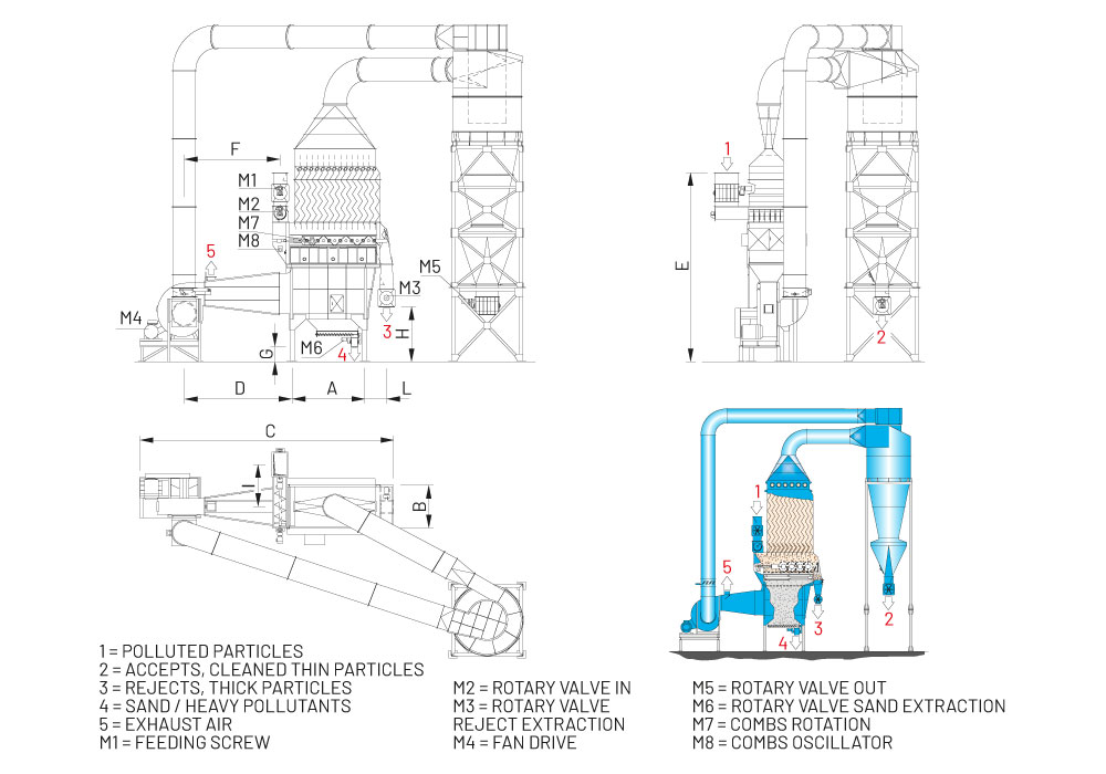 Cyclone and pipe have to be sized and located according to the process data for processed material and outfeed position |